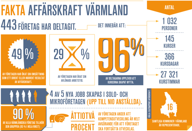 Den första omgången av Affärskraft avslutades under 2013 och resultatet är glädjande! 49 procent av de 443 företag som deltagit i projektet ökade sin omsättning och 29 procent ökade sin avlönade arbetstid. Företag från samtliga av Värmlands kommuner deltog och det hela resulterade i 1032 utbildade personer och 145 kurser.