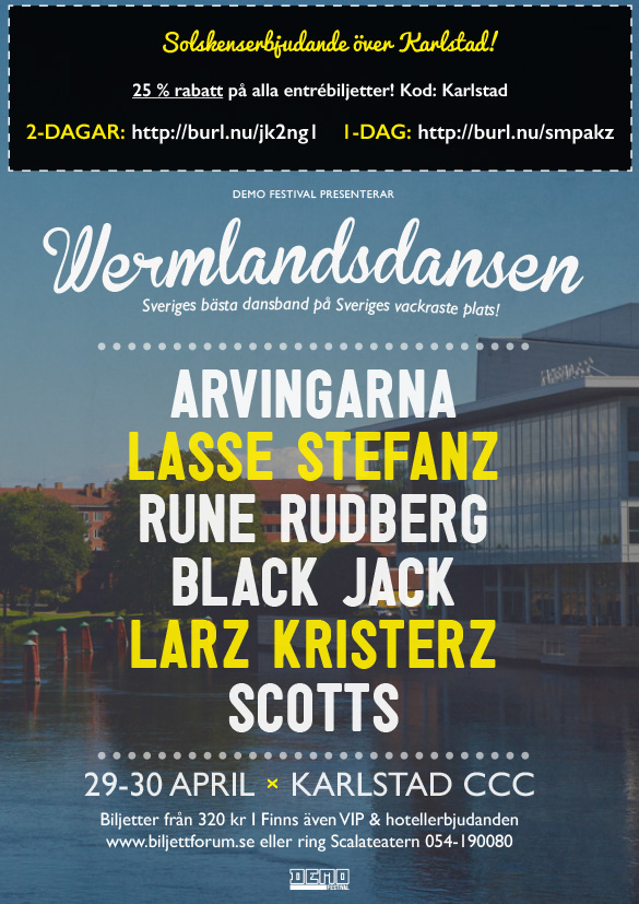 Vad sägs om Sveriges bästa dansband på Sveriges vackraste plats? Den 29-30 april 2016 arrangeras Wermlandsdansen på Karlstad CCC för första gången med Demo Festival som arrangör. Årets artistuppställning: Lasse-Stefanz, Larz-Kristerz, Arvingarna, Black Jack, Scotts, Rune Rudberg, Reset.